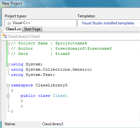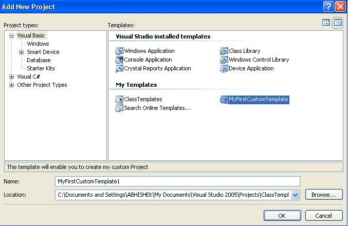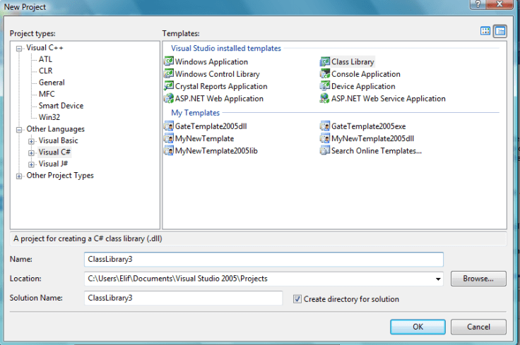 Proje şablonları, yeni bir proje yaratılacağı ve solution’a ekleneceği zaman kullanılır. Proje şablonu penceresi(aşağıdaki şekilde görüldüğü gibi), yeni bir proje yaratılacağı zaman (File -> New -> Project seçildiğinde) ortaya çıkar. Pencere açıldığında, Visual Studio kurulu ve kişisel şablonları bilgisayardaki yollardan arar. Kurulu şablonlar için Kurulu şablonlar için %ProgramFiles%\ [MicrosoftVisualStudio8]\Common7\IDE\ProjectTemplates\, kişisel şablonlar için ise %UserProfile%\MyDocuments\Visual Studio 2005\Templates\ProjectTemplates\ yolu aranır. Bu kütükler altında bir sürü zip arşivi bulunur. Bu dosyalar çıkarılıp bizim projemize arşivle bağlantılı olarak eklenir.