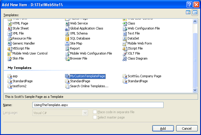 Item template’ler biri projeye yeni bir parça ekleyeceği zaman yaratılır. Dosyalar; bazı yasal notlar, isim alanları, yaratılma tarihleri eklenerek kişiselleştirilebilir. Proje şablonlarına benzer olarak; kurulu item’lar %ProgramFiles%\[MicrosoftVisualStudio8]\Common7\IDE\ItemTemplates\#1033\ kütüğü altında, kişisel item’lar ise %UserProfile%\MyDocuments\Visual Studio 2005\Templates\ItemTemplates\ kütüğü altında bulunur.