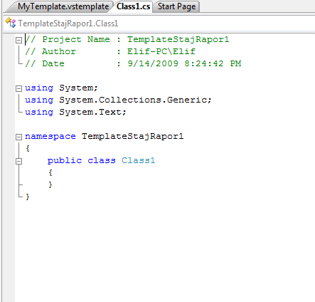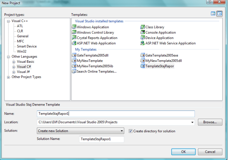 Next seçeneğiyle devam ettiğimizde aşağıdaki pencere açılacak. Aşağıdaki pencerede ilk seçenek, bize simge seçeneği sunmaktadır. İkinci seçenek, template için bir isim istemektedir. İsim olarak staj raporu için bir örnek oluştruduğum için TemplateStajRapor yazdım. Bir diğer seçenek ise bizden template için bir tanımlama yapmamızı istemektedir. Altında ise template’in oluşturulacağı konumu bizden istemektedir. ‘C:\Users\Elif\Documents\Visual Studio 2005\My Exported Templates\TemplateStajRapor.zip’ konumu template için olması gereken konumdur. Çünkü makinede kurulu olan değil sonradan oluşturulmuş bir şablon olacaktır. Finish butonunu tıkladığımızda template oluşturulmuş olacaktır ve ardından aşağıda bir sonra yer alan pencere açılacaktır.