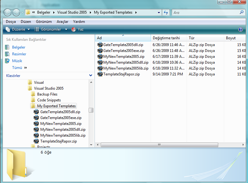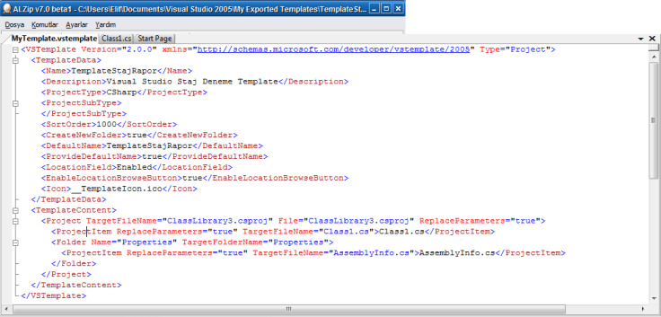 Ardından TemplateStajRapor.zip’i tıkladığımızda aşağıdaki pencere açılır. Bu pencerede yer alan öğeler TemplateStajRapor.zip’in içeriğidir. MyTemplate.vstemplate template’i oluşturan dosyadır.