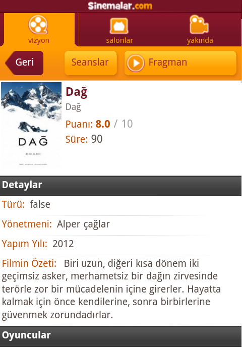 Geliştirim hakkında bir ufak yorumum olacak ki o da uygulamayı finish etmek konusunda. Uygulamayı sonlandırmak için back tuşuna 2 tane alert koymak bence çok kullanıcı dostu değil. Öte yandan sinemalar.com’un bu haftaki film gösteriminde Dağ filmiyle ilgili daha ciddi bir sıkıntı mevcut. Filmin türünde false yazıyor. Oysaki hiç olmazsa böyle bir case’i engellemek için hatalı data durumunda boş string gösterilmeliydi.