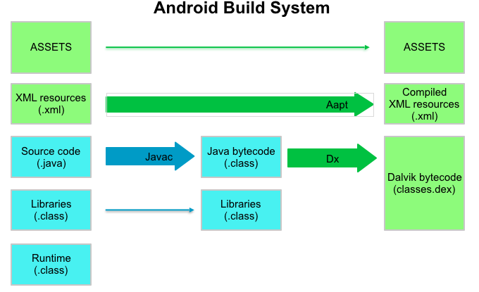 Android build sisteminde apk oluşana kadar default olarak çalışan mekanizmaya önce göz atacak olursak, Asset’ler apk’da olduğu gibi tutuluyor. AndroidManifest ya da layoutlar gibi xml dosyaları Aapt(Android Asset Packaging Tool) ile compile ediliyor. Bu arada R.java dosyası da oluşuyor. Bu sayede resource’lara referanslar üzerinden erişebiliyoruz.