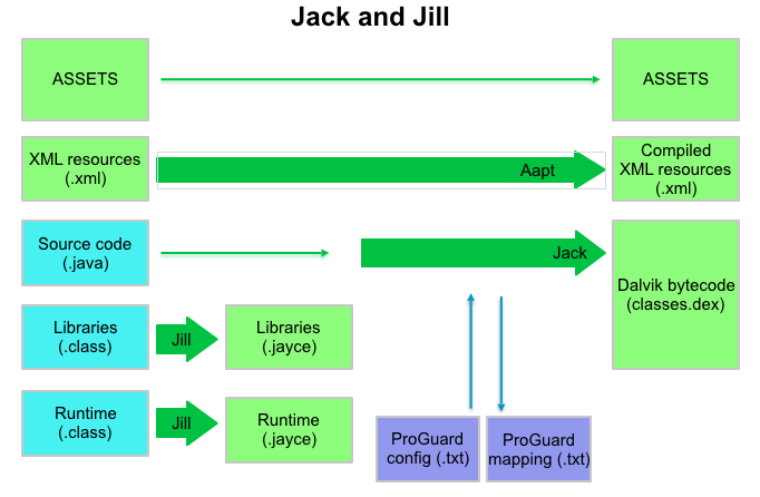 Jack üstteki imajda da görüldüğü gibi, java compiler yerine, java dosyalarını dex formatına çeviren bir toolchain. Jack’in, jack isimli kendi library formatı var. Repackinf, shrinking, obfuscation, multidex gibi birçok özelliği tek bir tool’la yapıyor. Verdiğimiz proguard talimatlarını da kullanıyor. Araya ayrı bir step girmiyor. Jill ise varolan .jar dosyalarının .class dosyalarının jack formatına çevrilmesini sağlıyor.