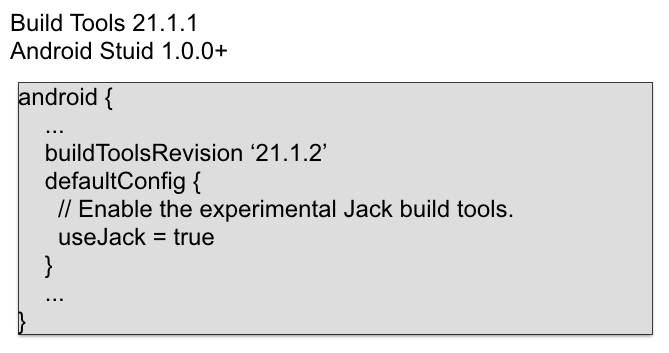 android { ... defaultConfig { ... jackOptions { enabled true } } compileOptions { sourceCompatibility JavaVersion.VERSION_1_8 targetCompatibility JavaVersion.VERSION_1_8 } }