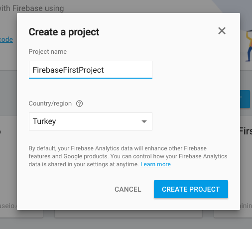 Öncelikle, https://firebase.google.com/’dan firebase’in free accountuna login olmanız gerekmektedir. Sitedeki olanakları inceleyebilirsiniz ancak free account’da da çok fazla ek olanak sağlandığı için en azından başlangıç için free accountla devam edilebilir. Ardından create new project seçeneğiyle ilerleyerek backend ini Firebase’de tutmak istediğimiz uygulamayı create edebiliriz.