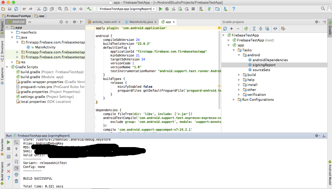 Buradan hangi platform için Firebase’i kullanmak istiyorsak onu seçip ilerliyoruz. Biz bu örnekte Android’le ilerleyeceğiz. Androidi seçtiğimizde aşağıdaki gibi ekranla karşılaşıyor olacağız. Burada package name, app name gibi değerler kendi girebileceğimiz, uygulamaya verdiğimiz olmakla beraber Debug signing certificate’i nasıl alacağınızı bilmiyorsanız bir sonraki imajdaki gibi uygulama seçilip ardından Gradle dosyası seçilir, refresh etme seçilir. İmajda da görüldüğü gibi app, tasks, android altındaki signing report çift tıklanmalıdır. Run sekmesinde toogle tasks executions/text mode’a tıklanırsa ilgili outputu görüyor oluruz.