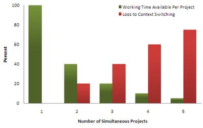 Bir önceki yazımda bahsetmemişim ancak product’dan bahsetmişken Scrum’ın en önemli maddelerinden biri olan multi tasking vs single task üzerinde de biraz durmakta fayda var. Şu an aynı anda kaç projede çalışıyorsunuz, 2-3-5-10 ? 3’den az değildir sanırım. Aşağıdaki grafik aynı anda çalıştığımız projelerin sayısı arttıkça context switching’den dolayı kaybettiğimiz zamanı gösteriyor. Tabi bu durum herkeste birebir aşağıdaki gibi olmayabilir, değişiklik gösterebilir. Scrum’da ise tek bir şey üzerine, sadece ürüne focus oluyoruz. Biraz takımdan bahsederek bu konuyu detaylandırmakta fayda var. Az önce dediğimiz gibi, bir Scrum takımı içerisinde geliştirilen ürüne göre yazılımcı, testçi, analist, tasarımcı bir arada yer alır. Ama her bir takım üyesinin de ürünün her bir aşamasında söz sahibi olduğunu söyledik. Peki bu nasıl oluyor?