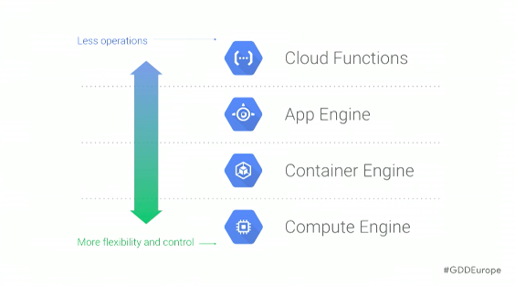 İkinci günün keynote’u ise biraz hangi Avrupa ofislerinde de ne kadar çok engineering yapıldığını göstermeye yönelikti. Google Asistant’da çok ciddi değişiklikler var ve şu anki haliyle gerçek bir kişisel asistan haline dönüştüğünü söyleyebiliriz. Yine daha detay için videoyu izlemek lazım. Genel olarak Cloud GDD’de üzerinde durulan konulardan biriydi ve çoğu şey de aslında Varşova’da da geliştirilmiş. Bu yüzden bilenlere tekrar bilmeyenler için küçük bir giriş yapıyoruz.İhtiyaçları karşılamak için ise cloud compute software’i çalıştırabileceğimiz 4 yer sunuyor diyebiliriz. Bunlar Compute Engine, Container Engine, App Engine ve cloud functions. Aşağıda daha fazla flexibilty ve kontrolümüz var. Automasyonu daha çok Google sağlıyor. Yani yukardaki kısımda biz kodumuzu ve business logimizi getiriyoruz gerisini Google hallediyor.Compute Engine bize bir virtual machine sağlıyor yani Google data center da bi makine var ve biz ona remote olarak bağlanıyoruz gibi.