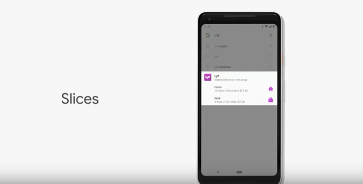 - Action’larla deeplink yaparak direk app’e bağlandık ama direk app’e bağlanmadan bir kısmını getirecek yeni bir şey daha geliştirilmiş. Slices olarak adlandırılıyor. Slices, app ui’ın bir kısmının app’e gitmeden kullanıcıya sunulması diyebiliriz sanırım özetle. Aşağıdaki imajda da görüldüğü gibi, Dave Burke lyft’i arattığında eve mi işe mi gitmek istediğini sordu. Tıklandığındaysa bu bilgiyle app’i açıyor. Early access önümüzdeki ay devrede olacakmış.