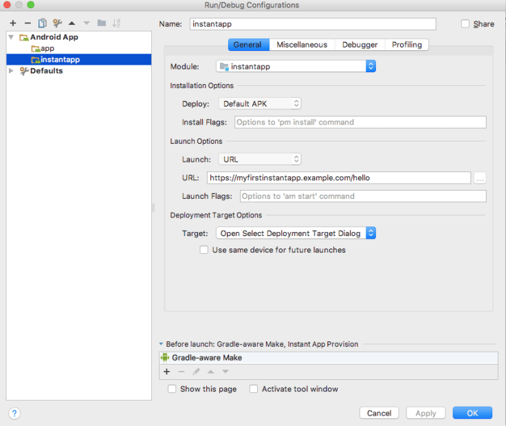 Eğer ki instant app’in konfigürasyonunla editle girerseniz de url’i başlangıçta verdiğimiz için değerler aşağıdaki gibi olacak. Bu basit uygulamayla tüm app’i hem installable hem de instant app olarak açmış olduk. 🙂