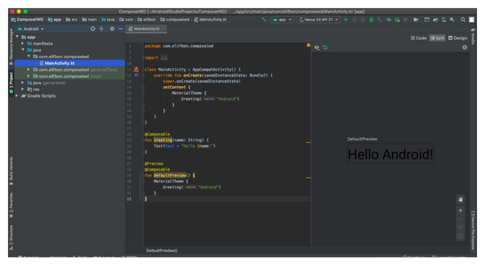 Bir de daha önce Android Studio’da karşılamadığımız yeni bir feature görüyoruz, default preview. @Preview’la annotate ettiğimiz compose fonksiyonunu default preview kısmında görebiliriz. Bana da bu da biraz flutter’daki hot reload’ı anımsattı.